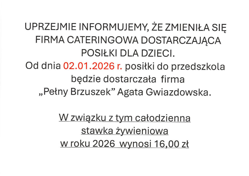 Informacja o zmianie firmy cateringowej od 02.01.2026 r. do 31.12.2026 r. oraz o stawce żywieniowej.