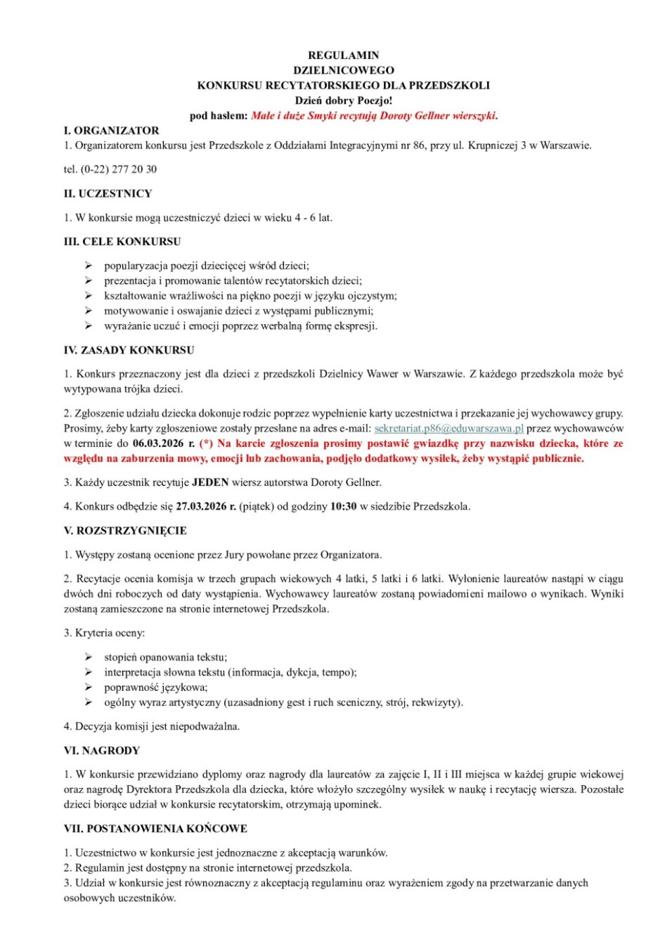 REGULAMIN DZIELNICOWEGO KONKURSU RECYTATORSKIEGO DLA PRZEDSZKOLI Dzień dobry Poezjo! pod hasłem: Małe i duże Smyki recytują Doroty Gellner wierszyki.